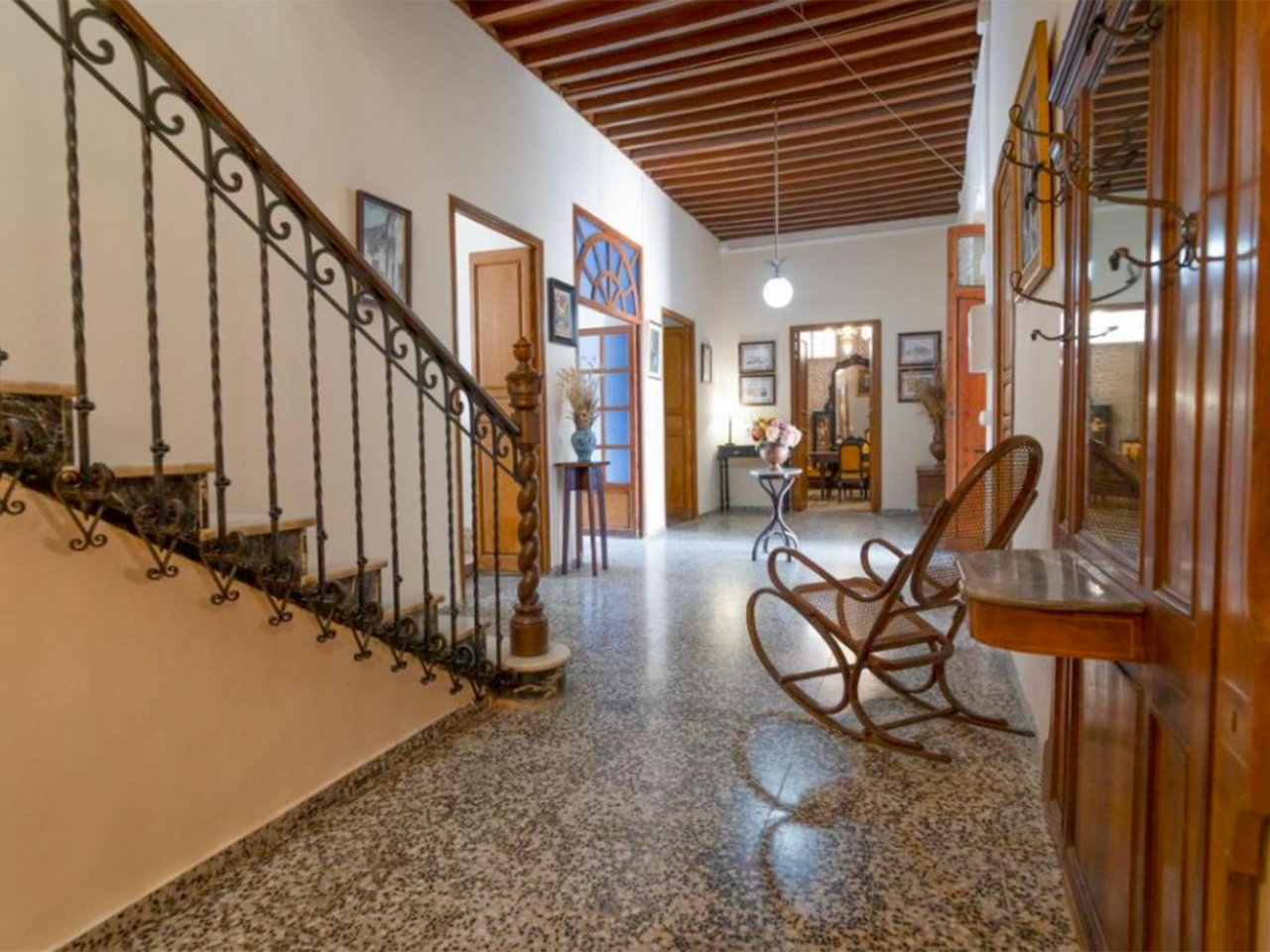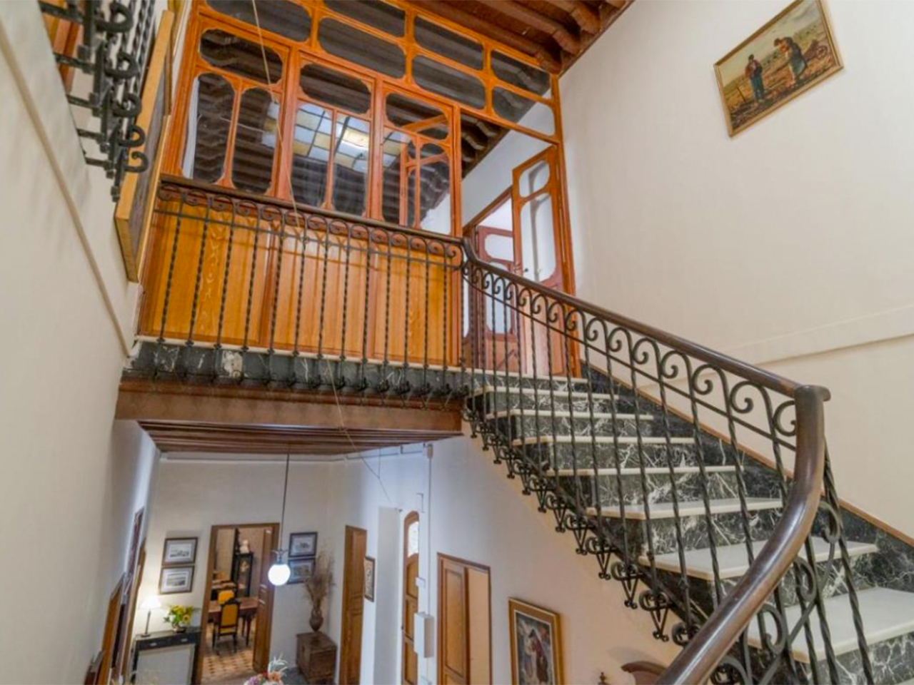 Escalera señorial con desarrollo amplio, peldañeado de mármol y barandilla de forja. Dispone